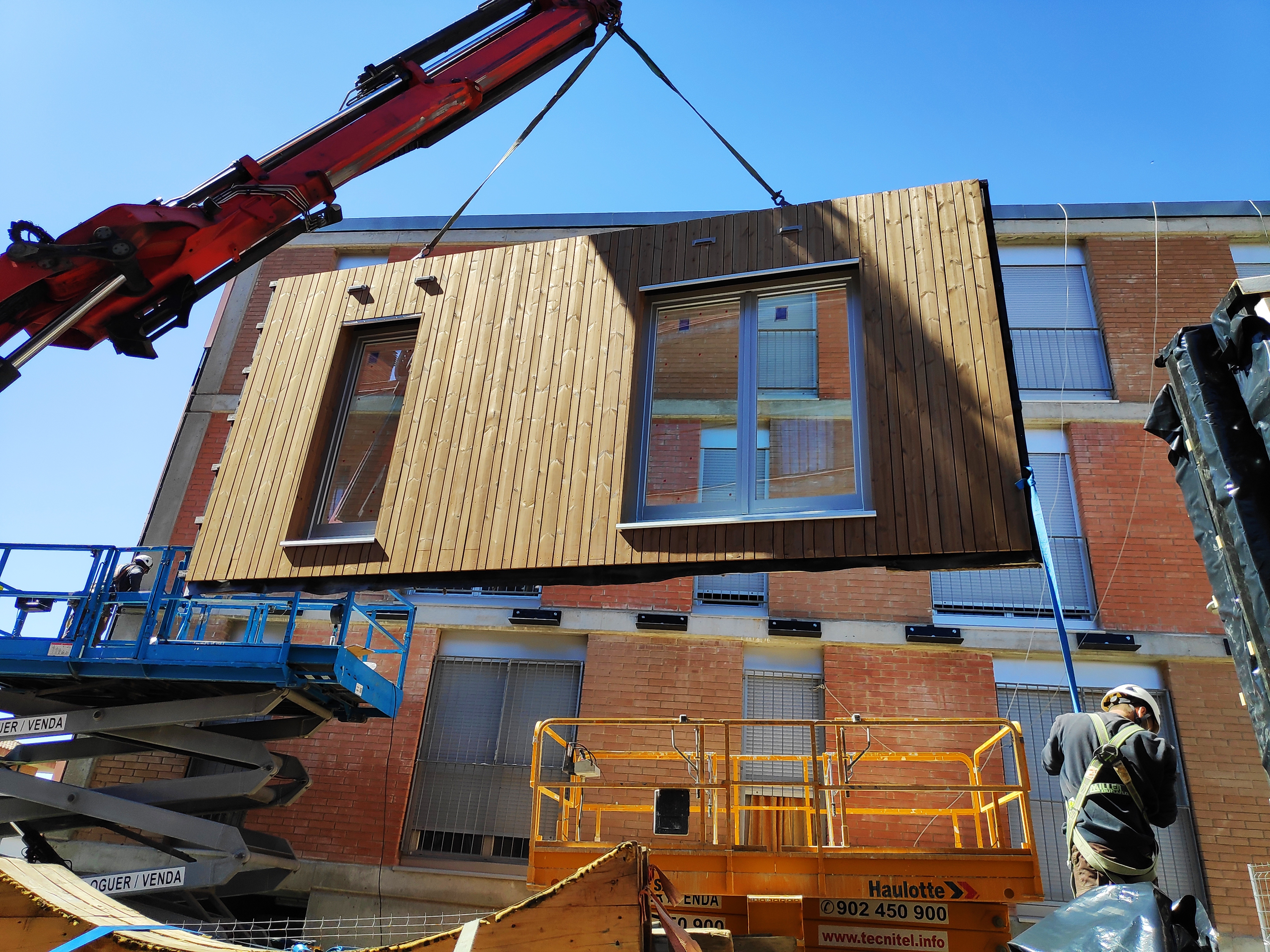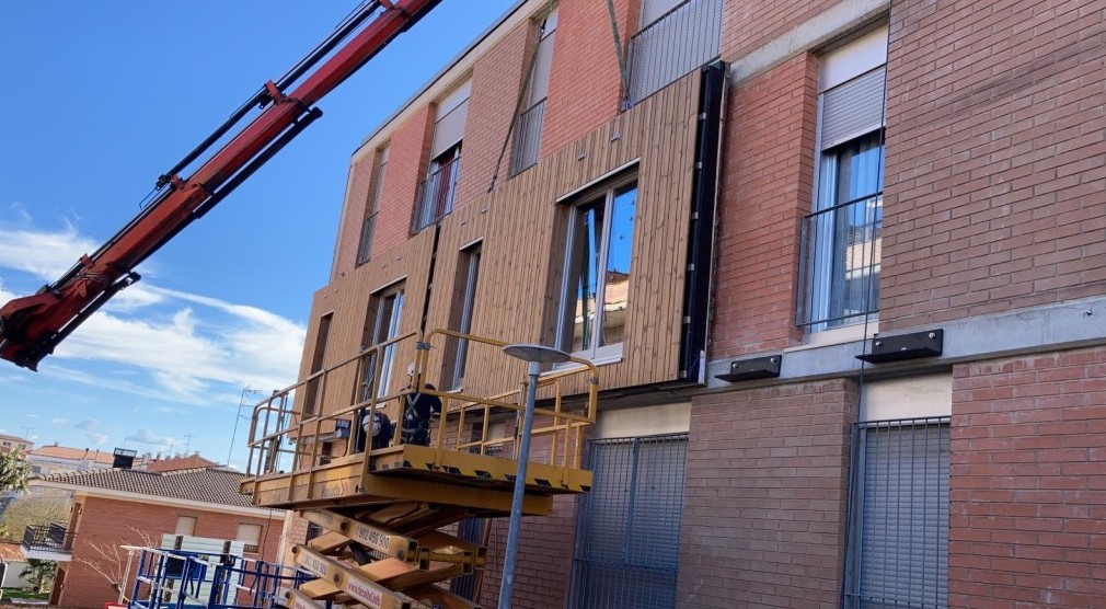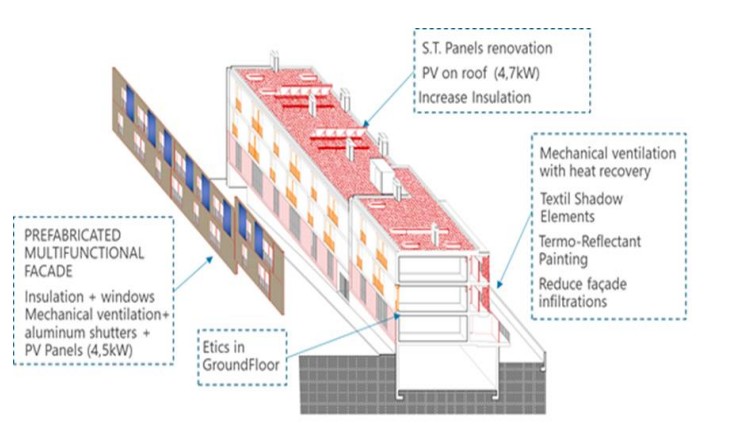The building underwent deep renovation with timber prefabricated multifunctional façade (PMF) on 1st and 2nd floors of east façade, integrating PV panels, ventilation systems, and new balconies.